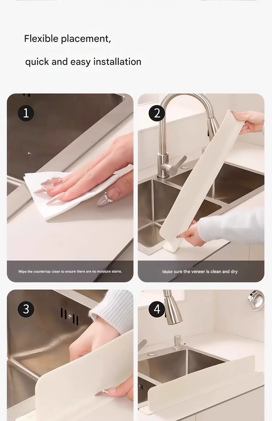 Integrated suction cup sink splash guard for kitchen countertops and bathroom vanities, extended sink splash guard strip